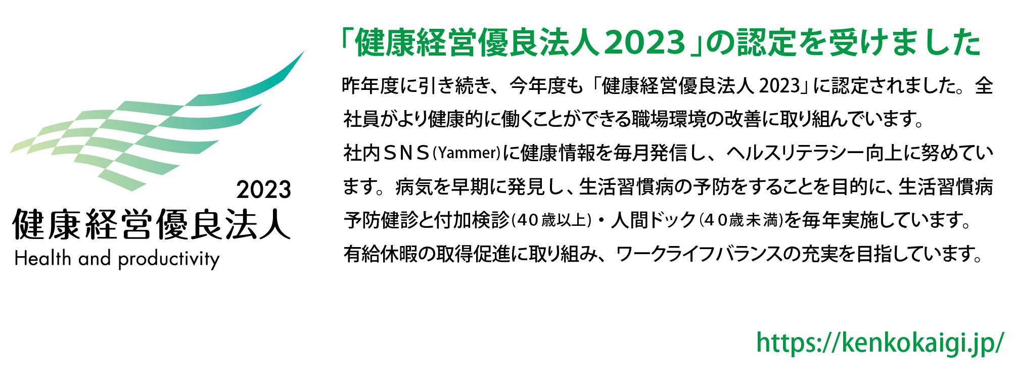 昨年度に引き続き、今年度も「健康経営優良法人2023」に認定されました。全社員がより健康的に働くことができる職場環境の改善に取り組んでいます。