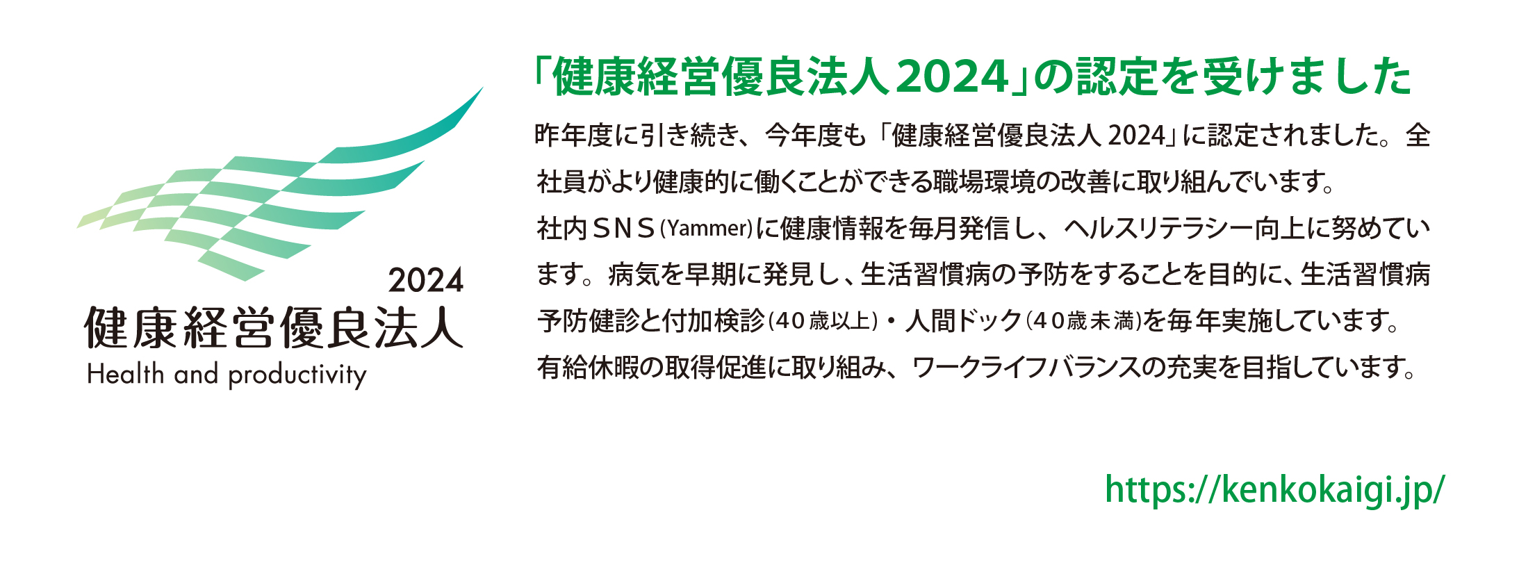 昨年度に引き続き、今年度も「健康経営優良法人2024」に認定されました。全社員がより健康的に働くことができる職場環境の改善に取り組んでいます。