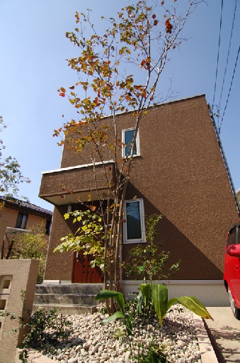 コブルを全面に敷き詰めた モダンなイメージ。日本の原風景を思い浮かべる・・・。そんなイメージに仕上げました。 シンボルツリーには、ヤマボウシの自然木を。ナチュラルな樹形の中にも煌びやかなイメージが出せるような樹木を選んで来ました。