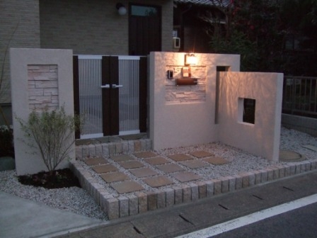 デザインは直線的でモダンなものとしながら、錆御影のピンコロや砂岩の板石、壁塗り材等に柔らかい色調を用いることにより、あたたかみのある門まわりとなりました。