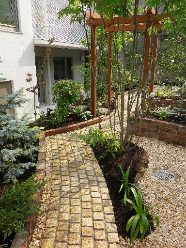 ミカゲのピンコロを敷き詰めた園路を辿り、ツルバラを伝わせた天然木のパーゴラの下を抜けると、リビング前に設けられた広々とした天然石貼のテラスに辿り着きます。