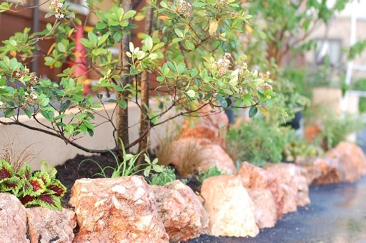 植栽帯の縁取りに、フィリピン産のピンクロックを使用しました。