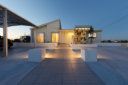 光が優しく反射することで、モダンな建物に暖かな表情を持たせています。