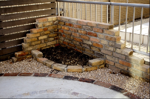 庭のコーナーにアンティークな雰囲気のレンガ花壇を