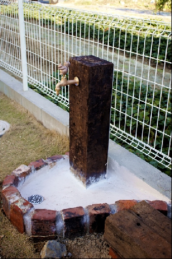 枕木と古レンガで造ったアンティーク感溢れる立水栓