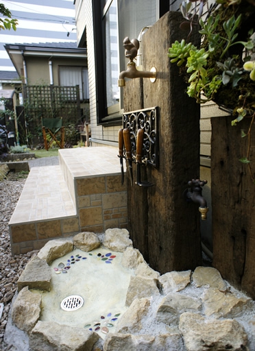 コッツウォルドのパンに枕木を3本立てて造る立水栓