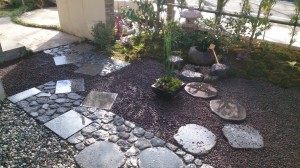 飛び石は溶岩と施主様邸の玄関タイルの余りを用いて、大沢石の延段と交差させ、少しモダンな雰囲気を取り入れました。