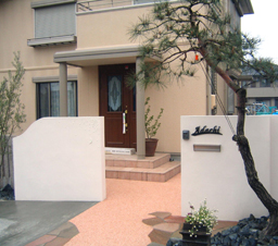 ピンクが鮮やかなアプローチ。透水性舗装・クオーツサイト・門柱、それぞれの個性が光るコーディネートです。