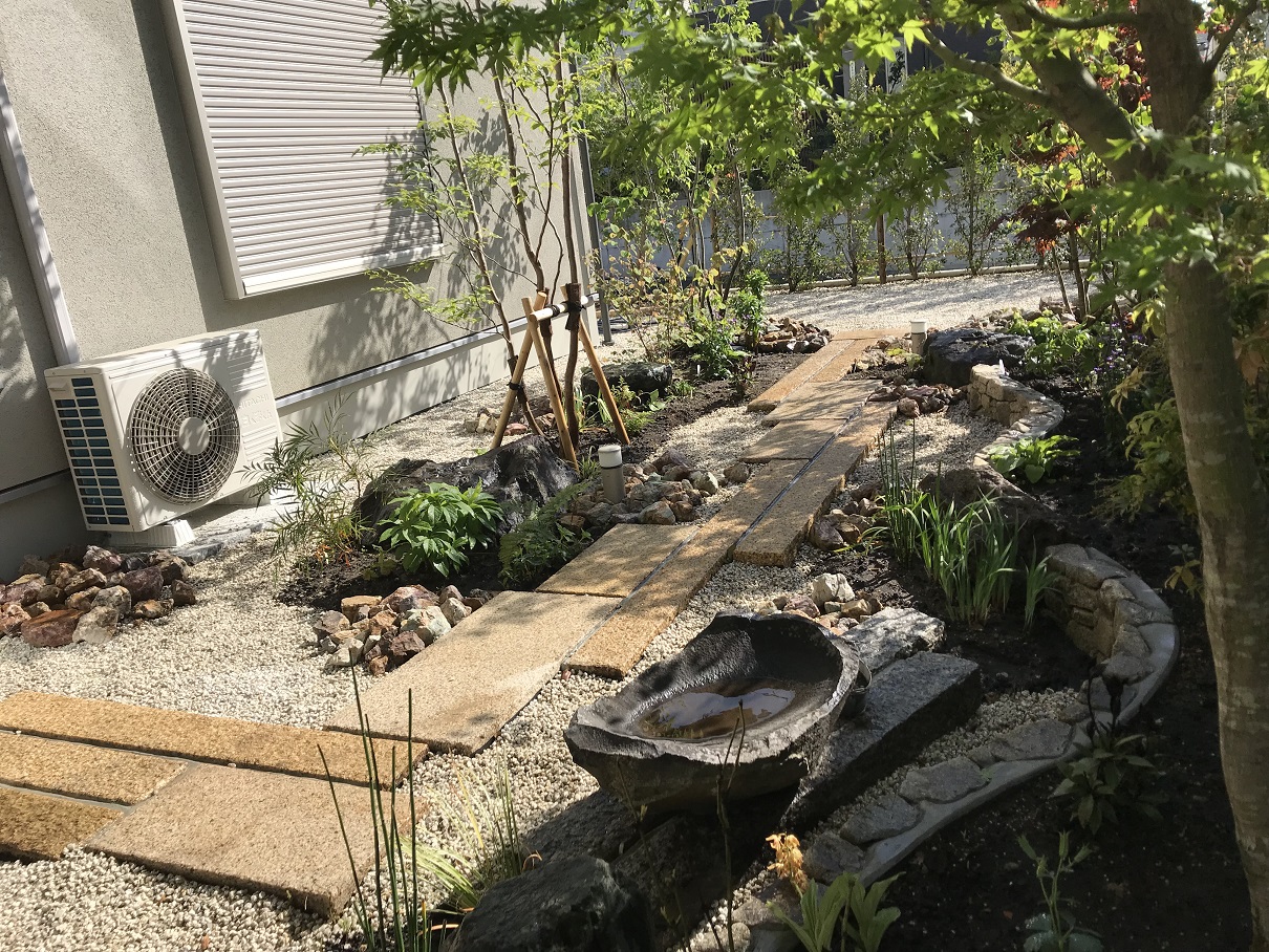 延べ石と板石をランダムに合わせ、行の小道の両サイドに植栽をし、これから施主さんが草花を植えて成長して行く庭を作りました。