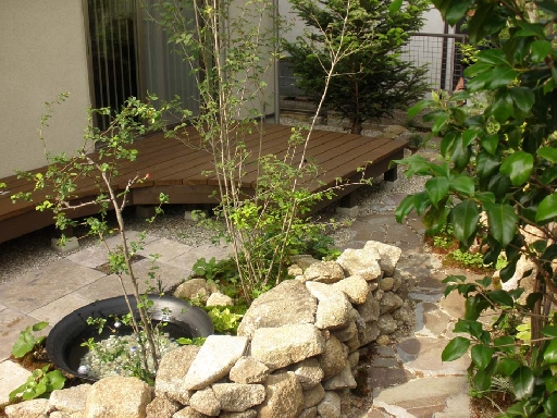 洋風でもなく、和風でもない、自然な雰囲気と季節を感じる庭です。ウッドデッキでくつろぎのひと時を楽しんでいただいています