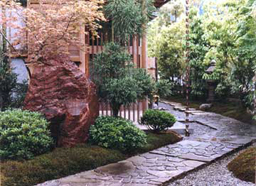 石畳には丹波鉄平を使い、周りには大磯砂利を使用、玄関前には六窓庵を立てた和風庭園